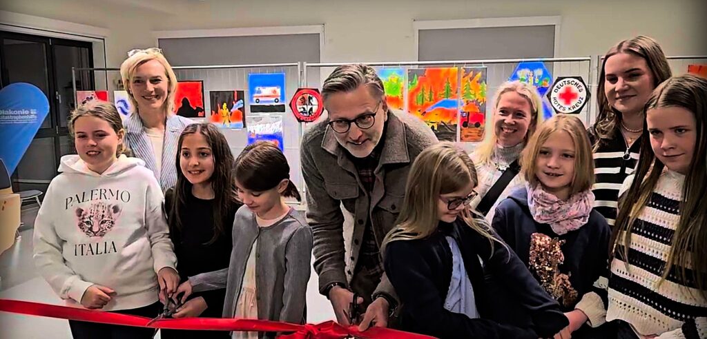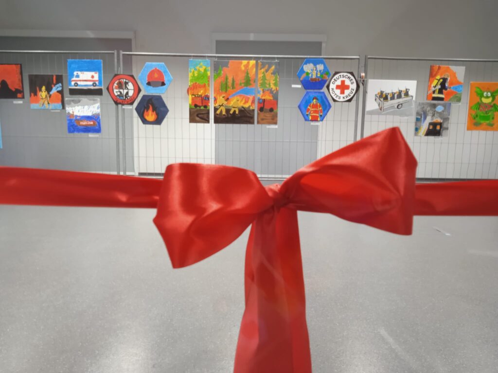 Die Kinder der Grundschule Parkstraße eröffneten gemeinsam mit dem Galeristen Detlev Kümmel eine Ausstellung, die weit mehr als bloße Bilder zeigt. Mit dem Durchschneiden des roten Bandes markierten sie den Start in eine Ausstellung, die das Thema Katastrophenvorsorge und Ehrenamt in den Mittelpunkt rückt und zugleich das Gemeinwesen stärken soll.